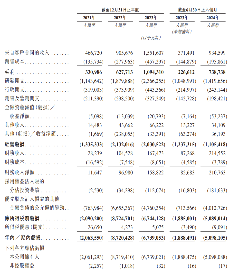 2021年、2022年、2023年,地平线机器人的营收分别为人民币4.667亿元、9.057亿元、15.516亿元。2024年上半年,地平线机器人的营收为人民币9.346亿元,同比增长151.6%,毛利率高达79%。